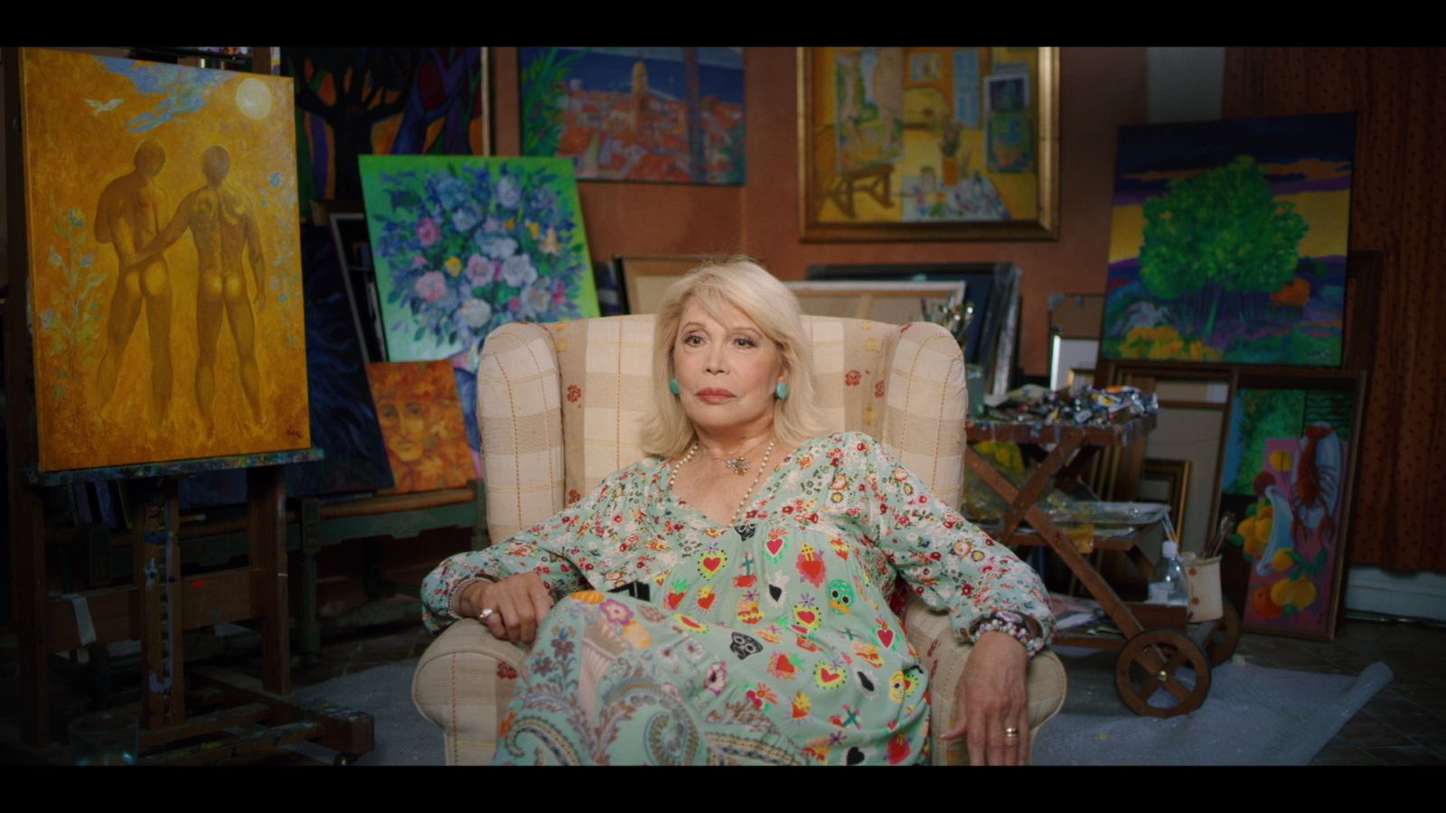 Lear playfully shoots the question back at Drucker and tells her, “Think whatever you want. It doesn’t change my life at all.” She denies her affiliation with Dalí, too. It’s worth noting, though, that Lear’s 1:1 interview sees her seated while surrounded by paintings—and pretty gay ones at that!—that evidence an artistic persona.