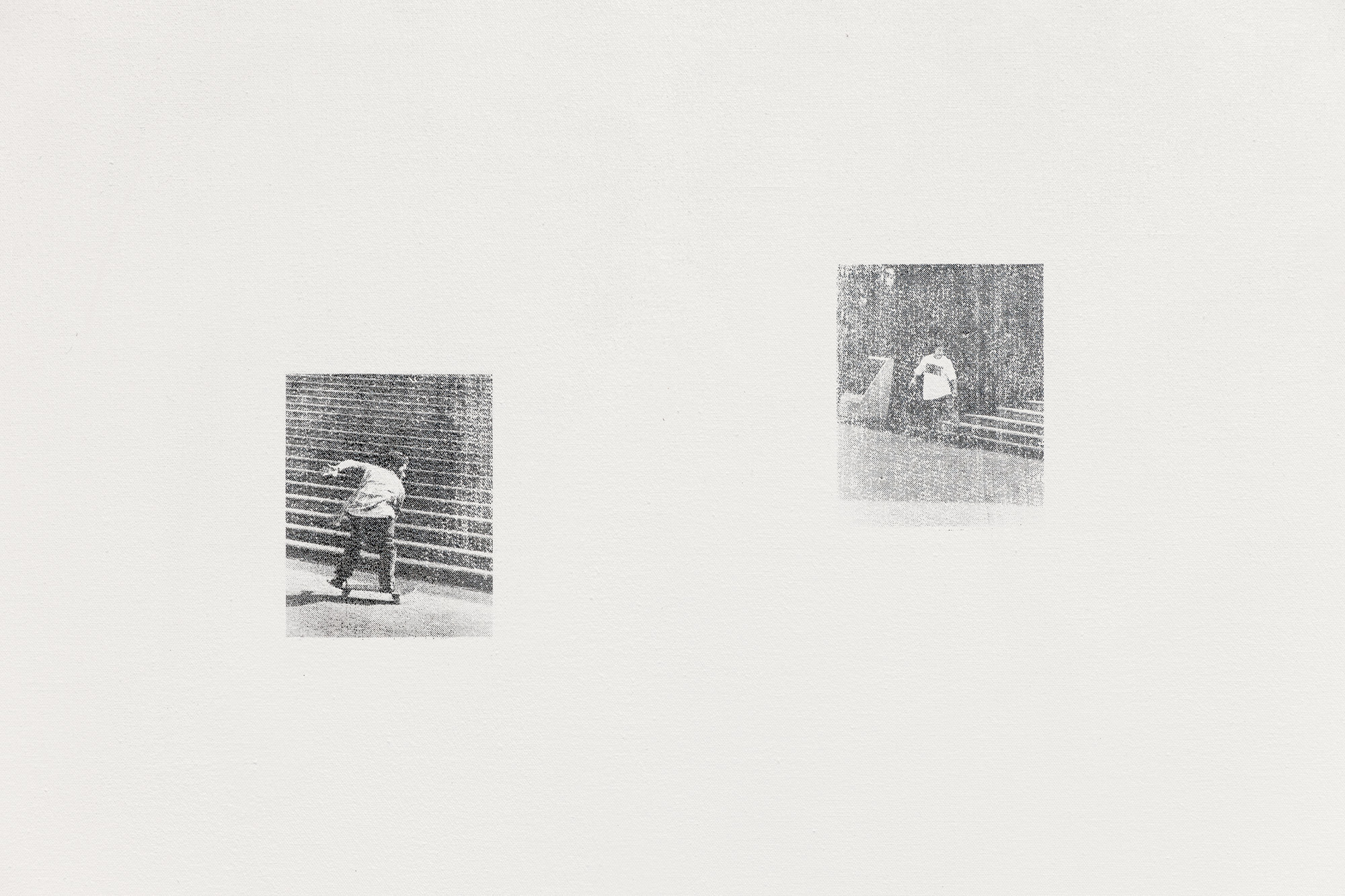 A similar impetus drives an earlier series, World Portrait, which the artist produced in 1991. For this series, Lum organized snapshots, taken while wandering the streets, according to types such as “Skateboarder,” “Dog,” “Woman with Bag,” or “Adult and Child.” Inspired by the writings of Hegel and Agamben, Lum probes the concept of identity, along with its opposite. He explains: “Your identity is not only defined by who you are but also by who you believe you are not.” The different figures are arranged on large white canvases whose negative space both unites and separates them. The result is unsettling. From afar, the work is pleasing in its abstraction. Up close, the cropped black-and-white screen prints arranged on the canvas recall surveillance images and intimate that someone or something else is determining where the figures fit. The categories call to mind how contemporary AI algorithms sort photographs, raising questions about who determines identity and what codes they use to do so.